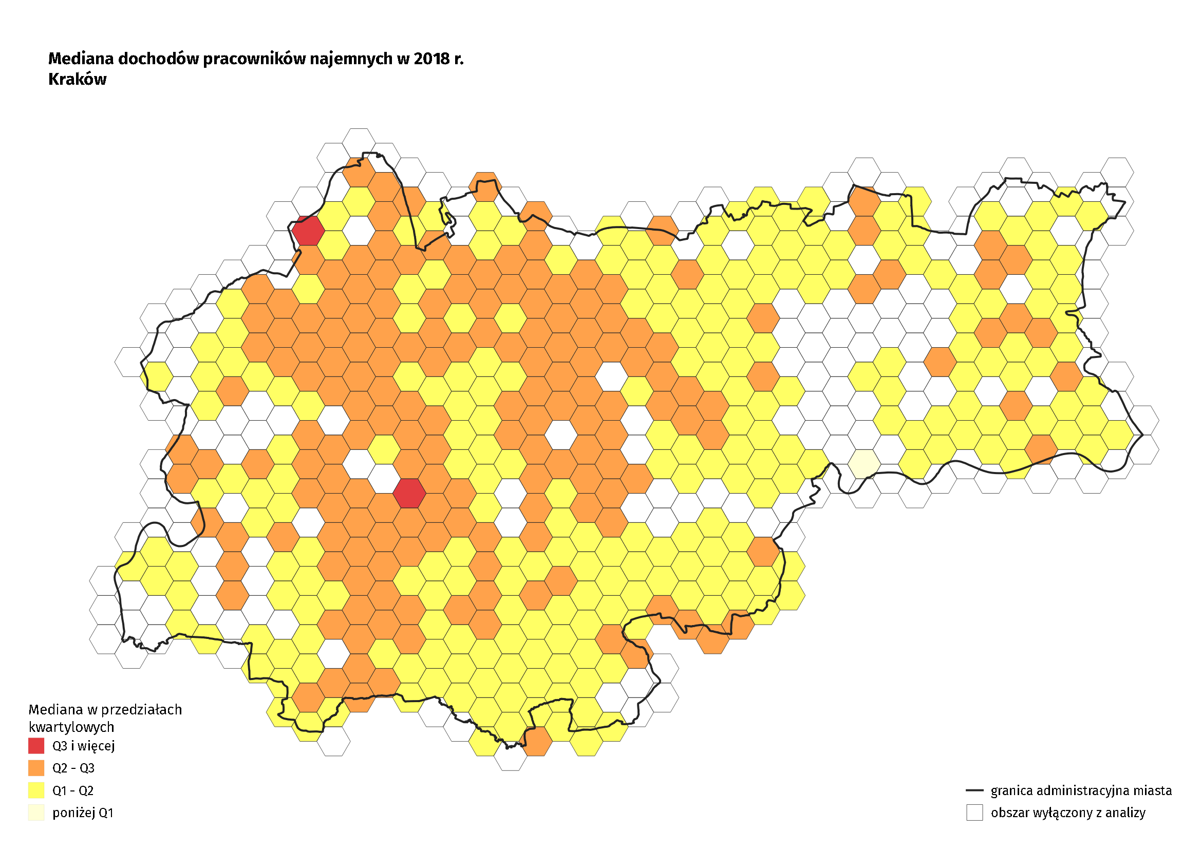 Wszystkie prezentowane w opracowaniu dane dotyczą roku 2018. Ze względu na konieczność zachowania tajemnicy statystycznej: z badania dotyczącego sytuacji dochodowej wyłączono jednostki (heksagony) o liczbie pracowników najemnych mniejszej niż 10 oraz o liczbie budynków mniejszej niż 3, dane dotyczące dochodów pracowników najemnych przedstawiono wyłącznie na siatce heksagonów o boku 500 metrów.